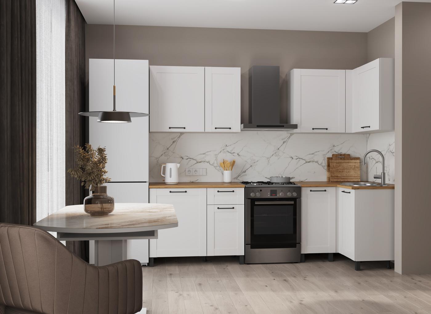 Кухня Аризона (вариант1) (белый / столешница: дуб вотан / ДВПО: белый / профиль: ПВХ белый О) исполняется в классическом стиле и спокойных цветах. Модель сочетает в себе простоту и функциональность, но при этом не выглядит громоздко. Она гармонично впишется в пространство, не утяжеляя его.
